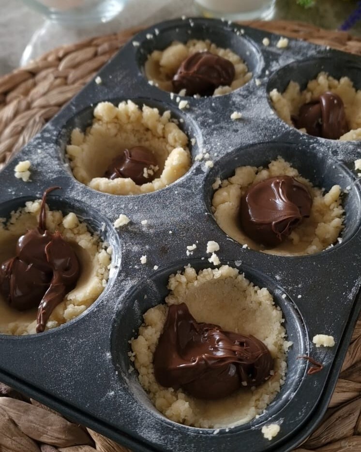 • At this point, butter and flour the muffin molds, then distribute half of the crumb mixture in the molds to create the muffin base. Next, fill the center with Nutella.