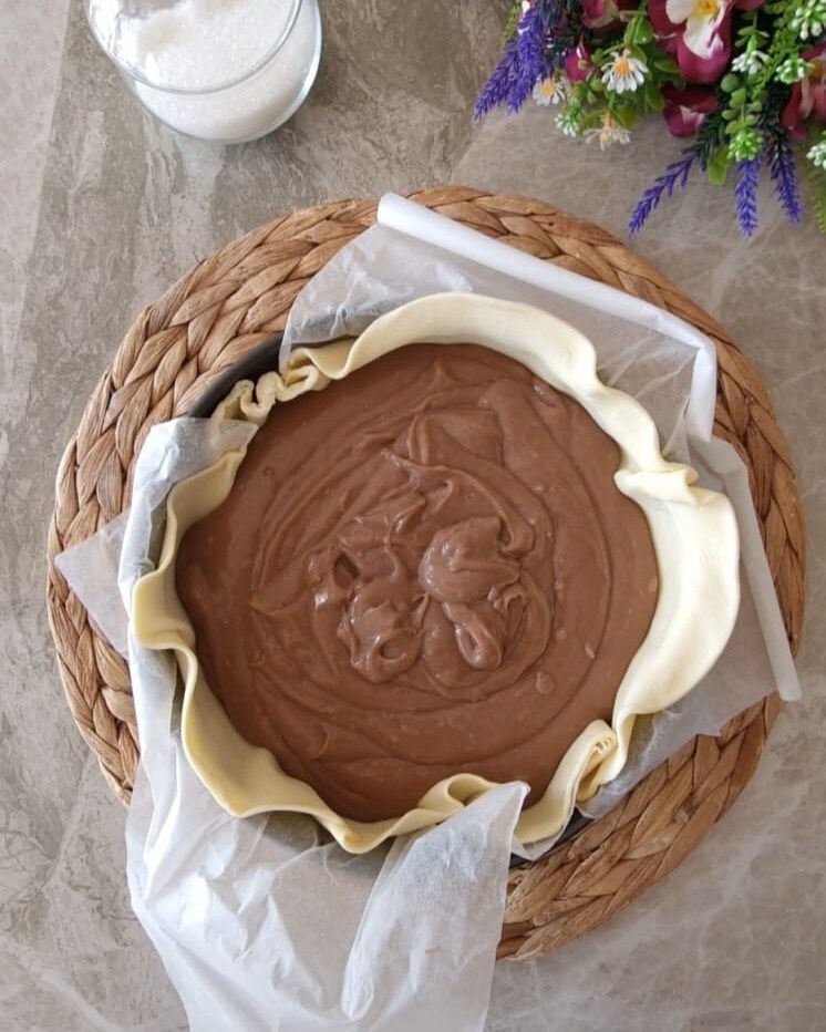 At this point, unroll the puff pastry and line a 9-inch diameter springform pan with its parchment paper. Pour the cream inside and bake in a static oven for about 50 minutes at 340°F.