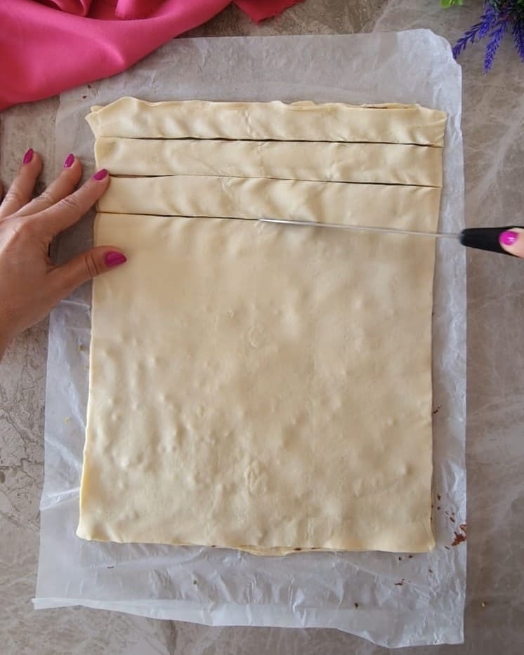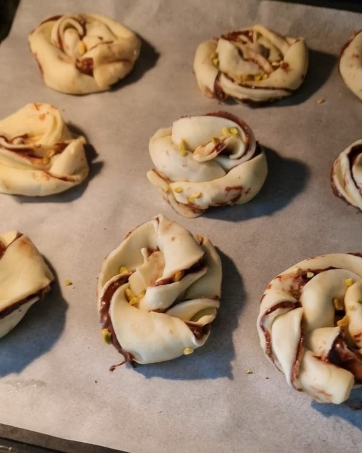Spread the surface with Nutella, and also add the chopped pistachios, then close with the second sheet of pastry.