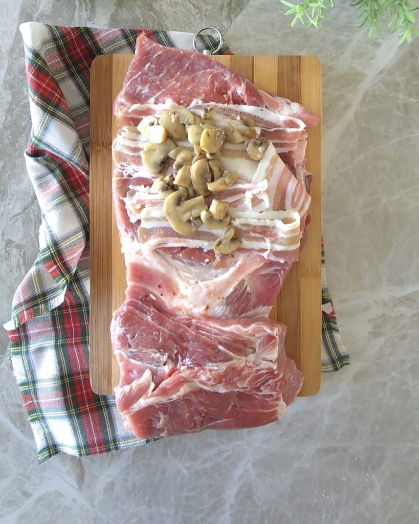Take the meat back and stuff it with the slices of bacon and the prepared mushrooms.