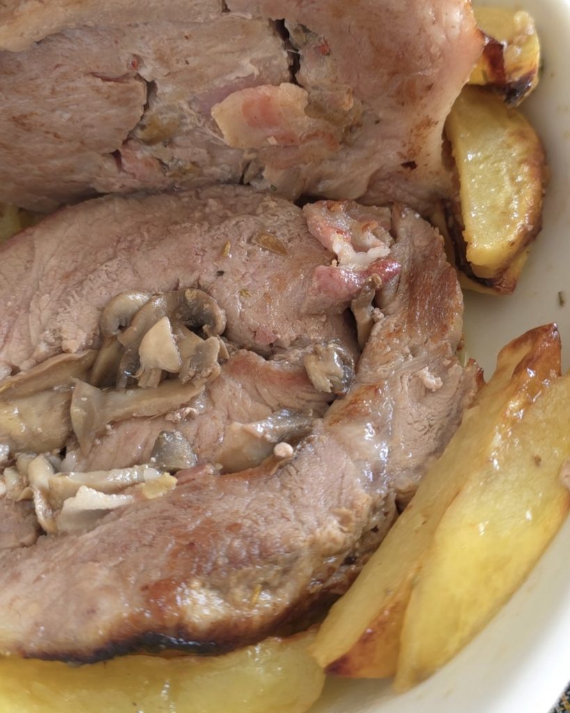 Oven-baked pork roast with bacon, an ideal main course for family Sundays and Holidays. Easy and tasty recipe, nothing to envy to the great classics of Italian cuisine such as pot roast or braised beef. The roast stuffed with mushrooms can be prepared well in advance and left to marinate in the refrigerator until the day of serving. After cooking, the meat remains tender and flavorful, and you can serve it with classic potatoes or Texan potatoes or a light salad. The oven-baked pork roast is stuffed with mushrooms and bacon, so it’s quite hearty. If you have time, you can prepare it the day before and keep it in the refrigerator until it’s time to cook; it will definitely be even more delicious.