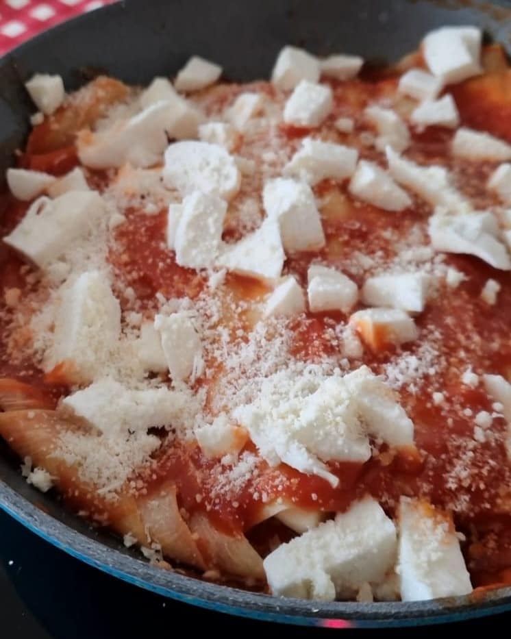The pan-cooked lasagna can be stored in the refrigerator, covered with plastic wrap, until the next day. To make your lasagna even richer, you can add sliced cooked ham with some béchamel.