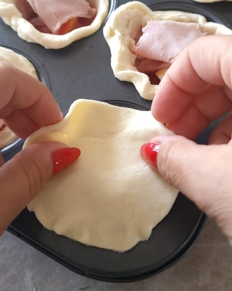 • Place them in a pre-oiled muffin mold, then fill them with scamorza cheese, cooked ham, and tomato sauce.