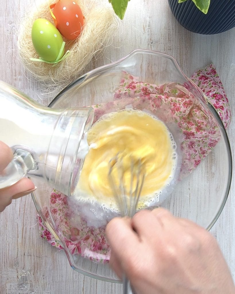 In a large bowl, beat the eggs with a pinch of salt using a mixer until they become a white foam.