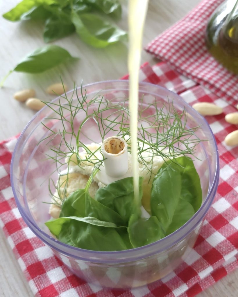 At this point, place it in a blender and add the rest of the ingredients: orange juice, almonds, basil, the wild fennel, garlic, and Parmesan cheese.