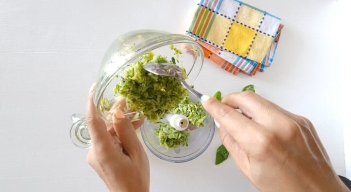• Place the zucchini in a blender, add the grated parmesan cheese, basil, and enough extra virgin olive oil.