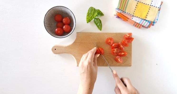 • Meanwhile, cut the cherry tomatoes in half and set aside.