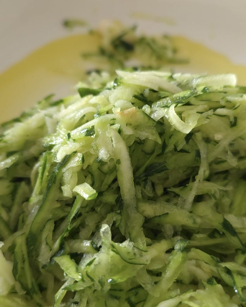 • Cook the pasta in salted boiling water as needed; meanwhile, trim the ends of the zucchini, then grate it using a large-hole grater.
