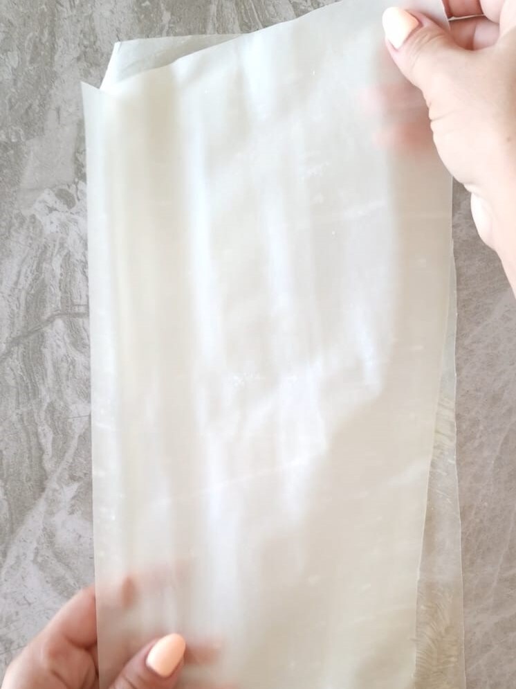 • Roll out the phyllo dough, making a rectangle about 10-12 inches long. Brush the surface with melted butter.