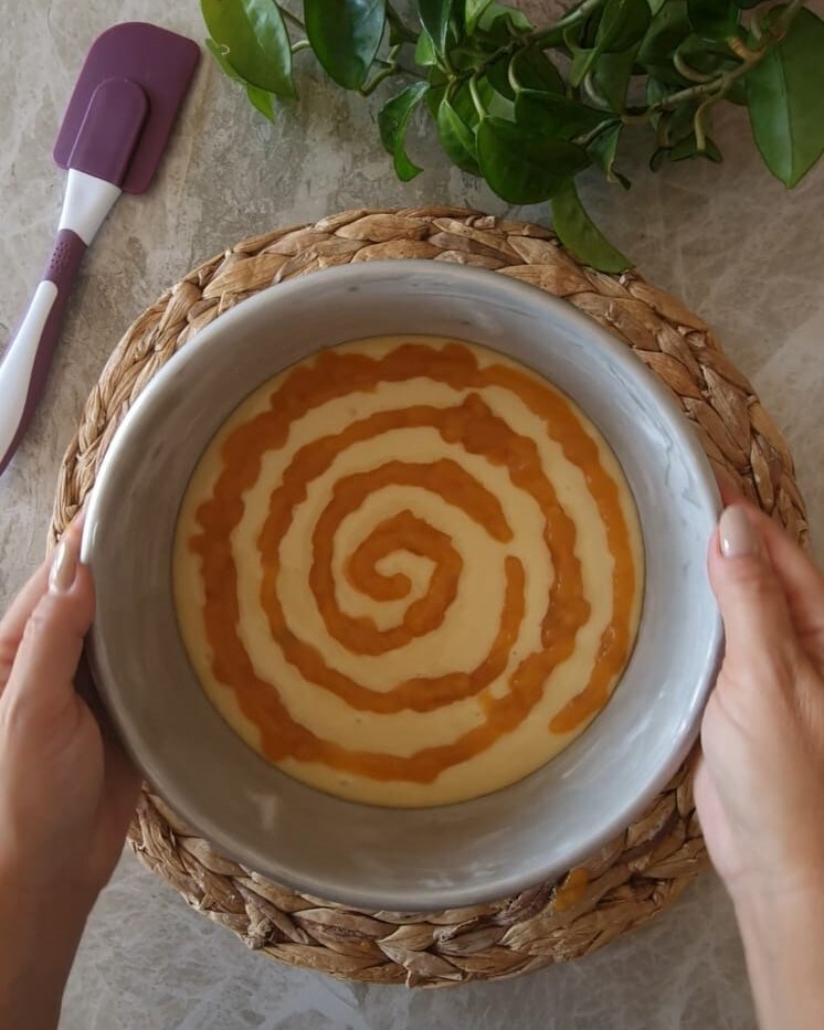 At this point, using a piping bag filled with jam, draw a spiral on top of the batter as you see in the photo.