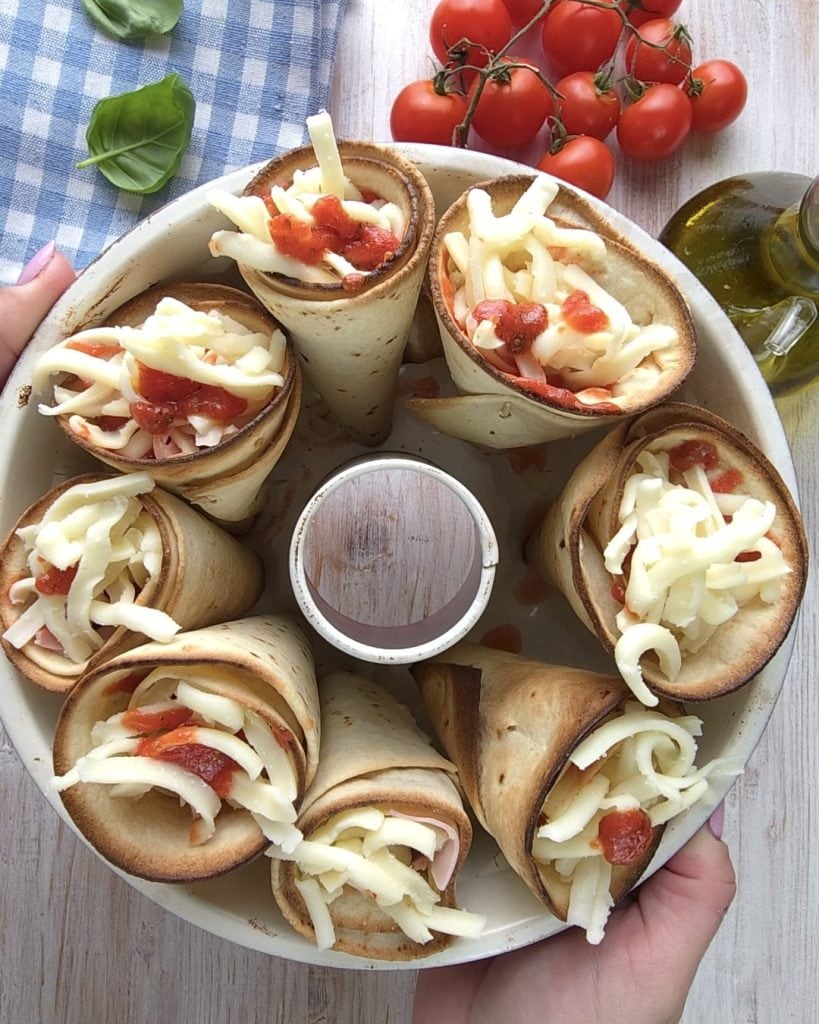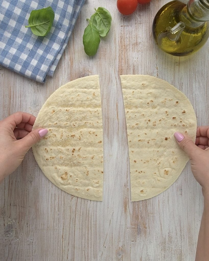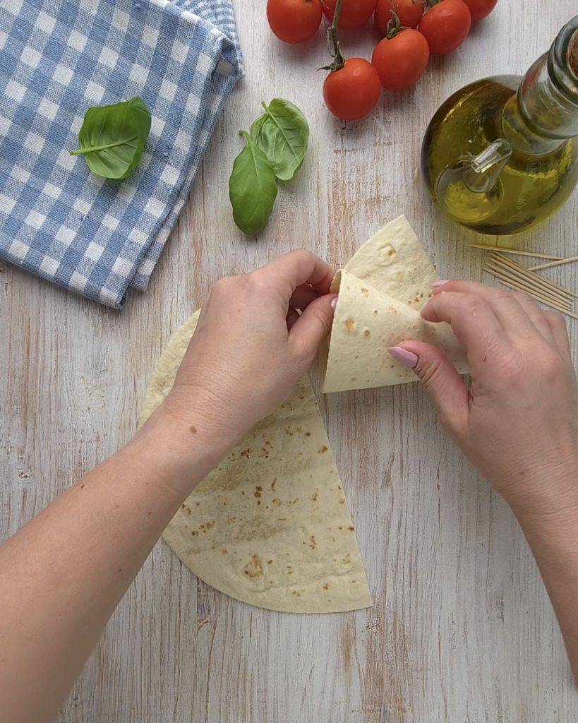 Create a cone by rolling each part of the flatbread, then secure them in that shape using a toothpick.