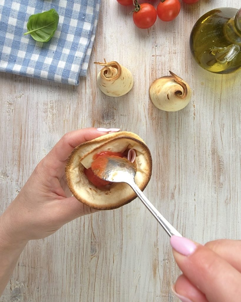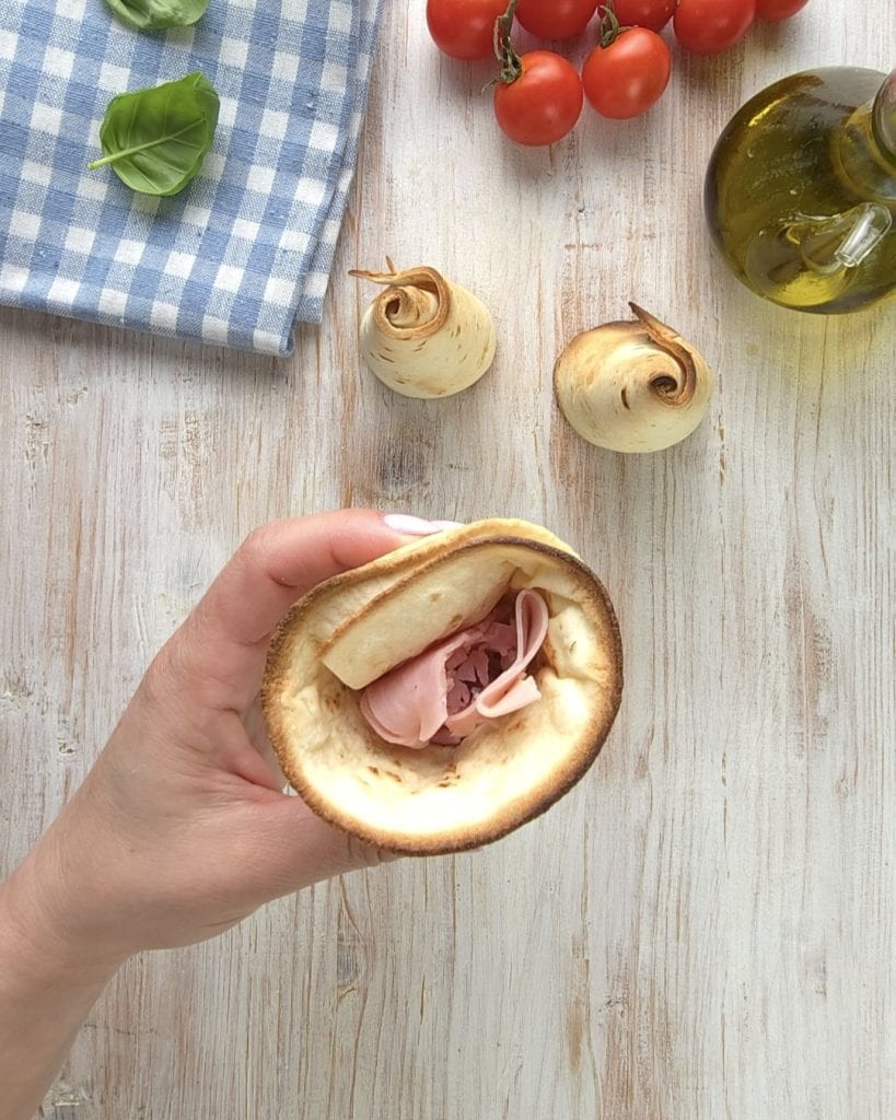 Pizza Cones quick and tasty recipe perfect for an aperitif. I love preparing oil-based flatbreads; some time ago, I also made layered flatbreads. But today, I propose a fun and quick version: The flatbread is rolled into a cone shape, creating a crunchy shell. They are very versatile and can be filled in countless ways with cured meats and cheeses, or with a tasty chicken salad but also in a vegetarian version with tomato sauce, eggplants, zucchinis, or sautéed mushrooms. For a touch of freshness, you can add arugula or fresh lamb’s lettuce.