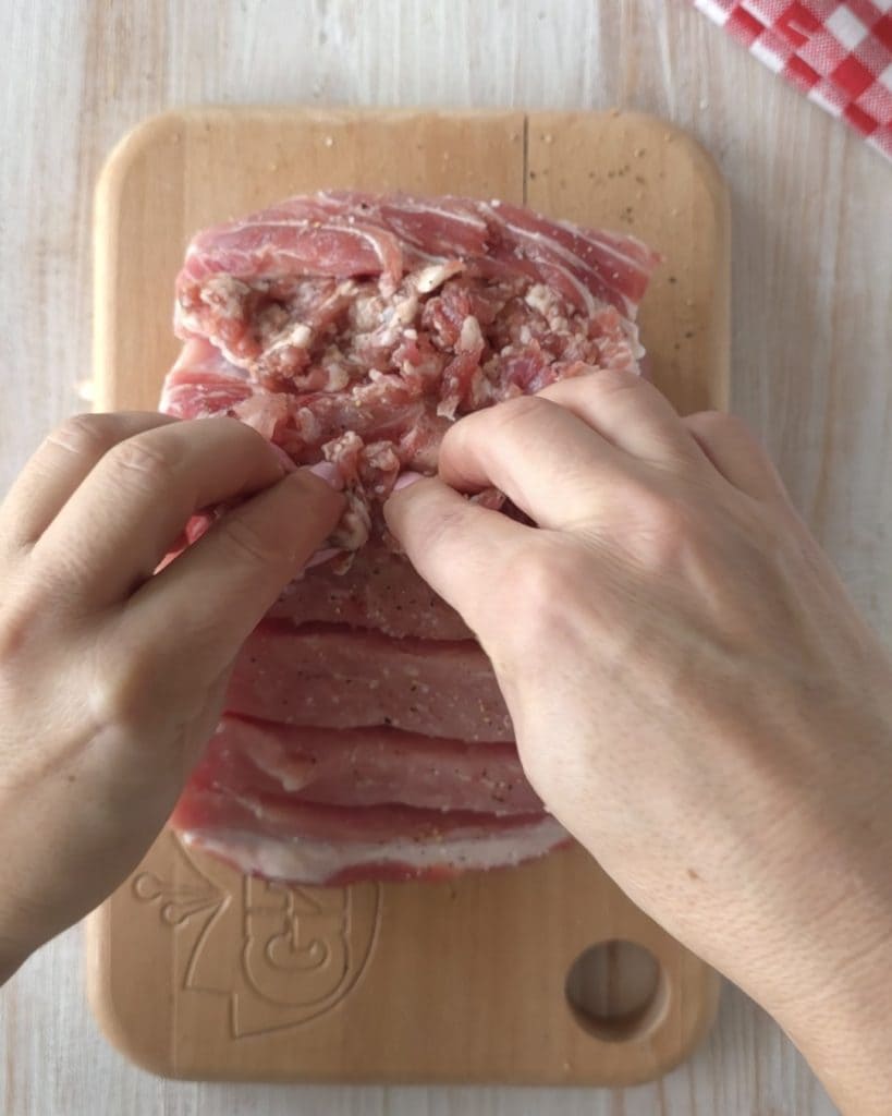 At this point, tie the meat with kitchen string to keep it from opening during cooking.