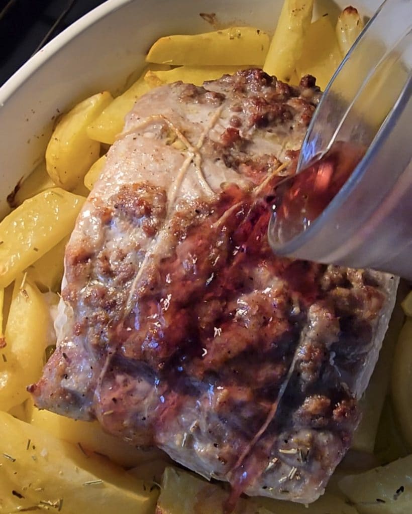 Bake the pork loin with sausages and potatoes in a preheated oven at a temperature of 356°F for 20 minutes, then quickly open the oven and pour the wine over the entire surface of the meat.