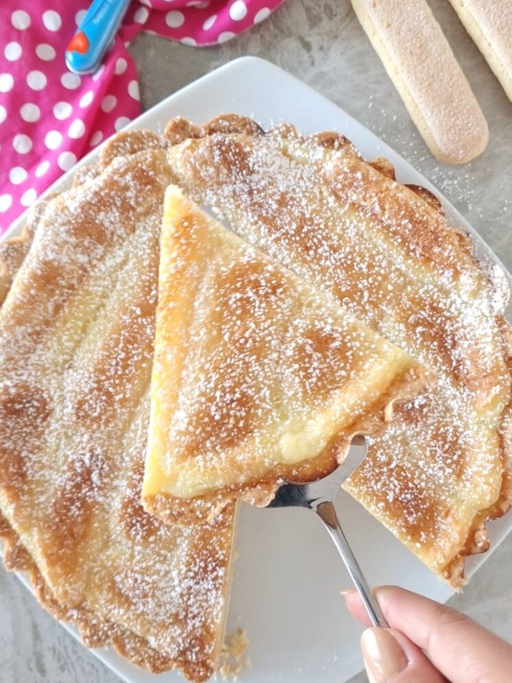 The Portuguese tart or Beneventana tart, is a truly delicious dessert, originating in the province of Benevento. In reality, it is not a tart, but a pie; the base is made of shortcrust pastry, while the top is filled with ladyfingers, milk, and eggs, all flavored with Strega liqueur.