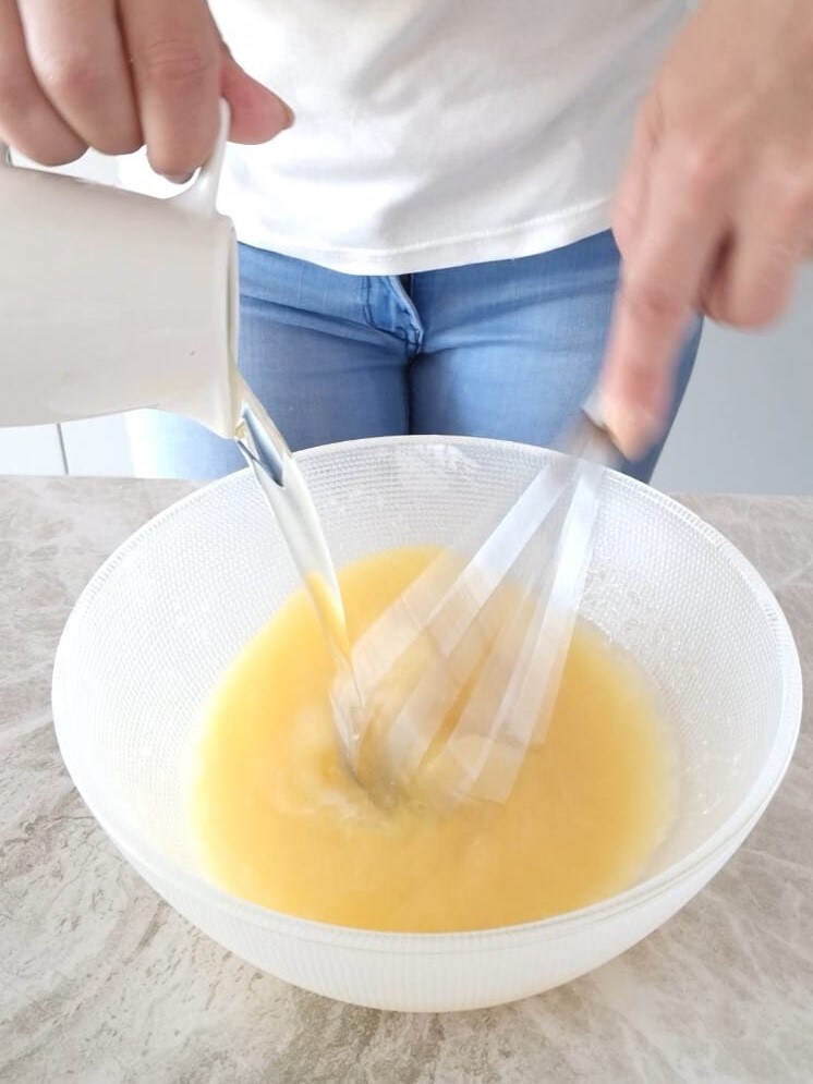 Break the eggs into a bowl, add the sugar, and mix quickly with a whisk.