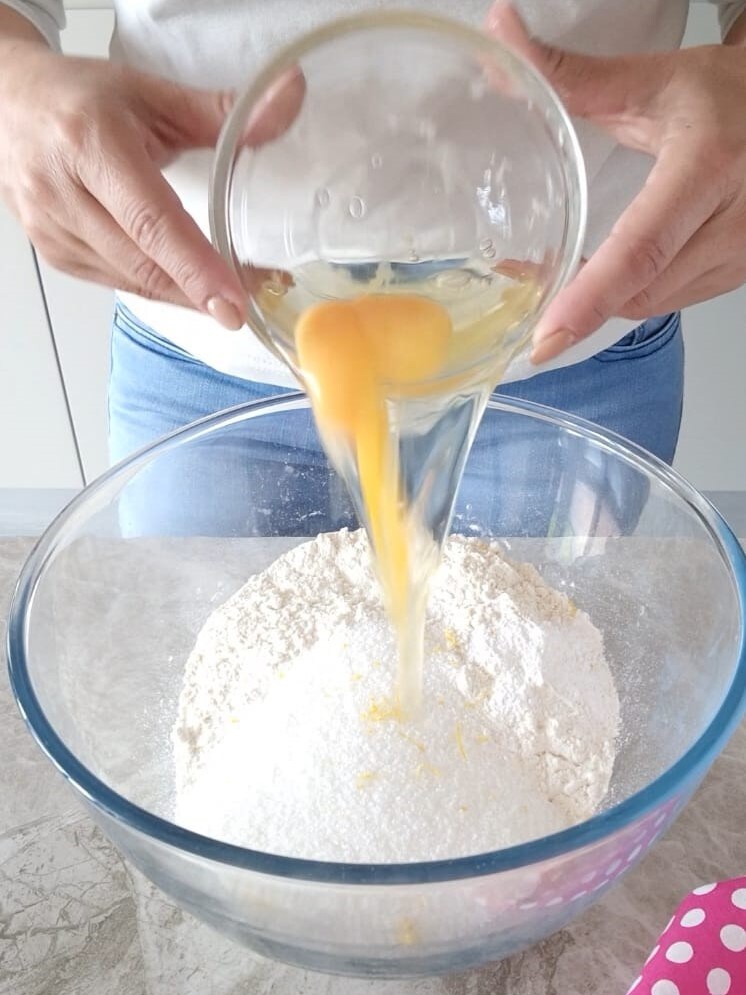 In a bowl, pour the flour, baking powder, sugar, and grated lemon zest, the cold butter cut into pieces, and the eggs.