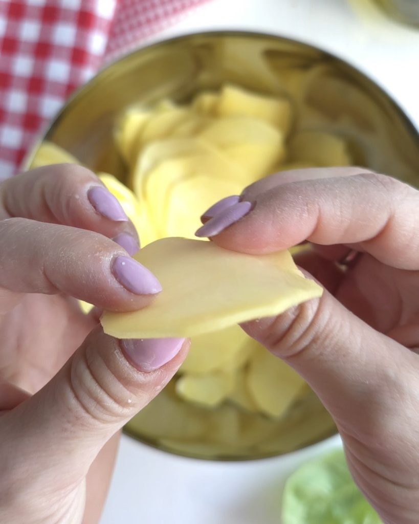 Wash the potatoes, then slice them thinly, about 1/8 inch thick, I used a mandoline for precise cuts.