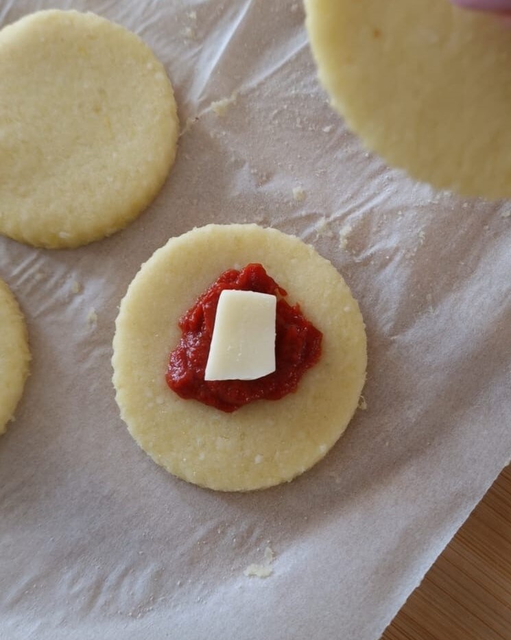 • Place the filling in the center of the molds: a teaspoon of tomato paste, oregano, and cheese.