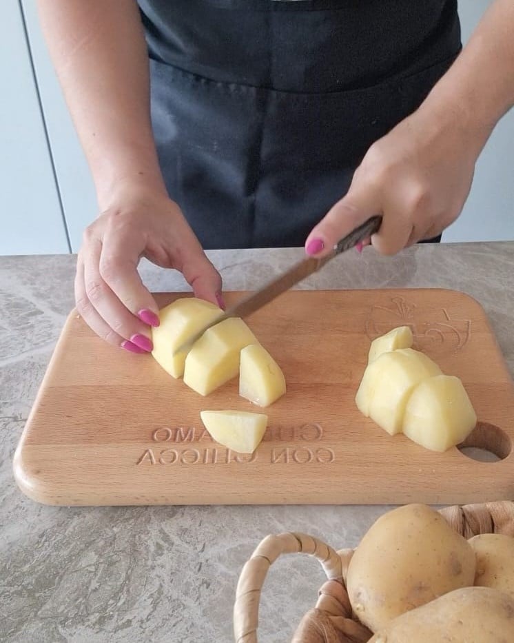 • Wash the potatoes under running water and peel them. Then cut them into cubes, making sure to keep the same size.