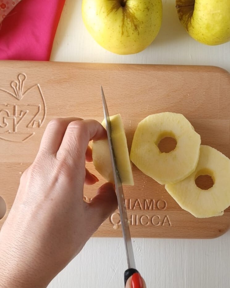 • Then slice and wrap a strip around the apple slice, as shown in the picture.