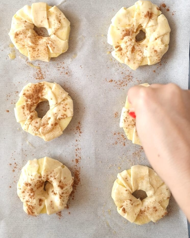 Puff pastry apple donuts are an easy and quick dessert to prepare at the last minute. You will need just a few essential ingredients: puff pastry, apples of your choice, cinnamon, and brown sugar.