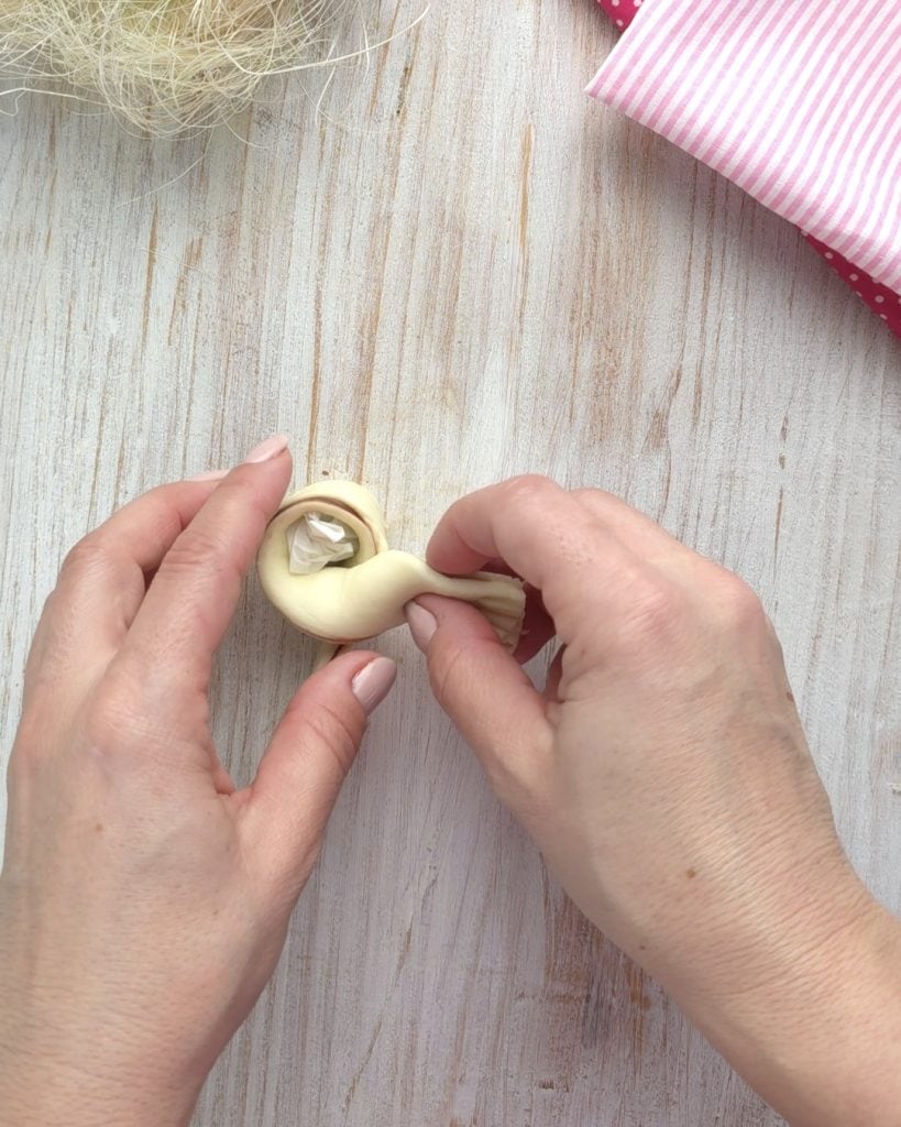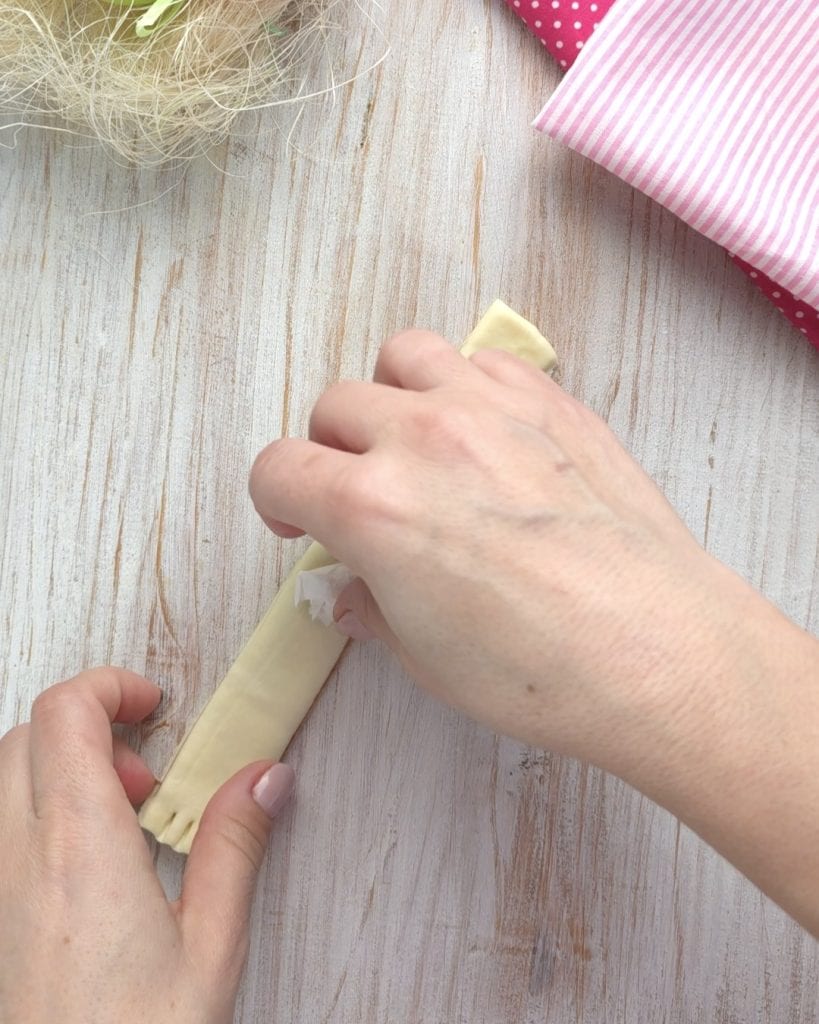 Take some parchment paper and create rough balls. Form the bunnies by intertwining the two ends of the strip, placing the paper ball in the center.