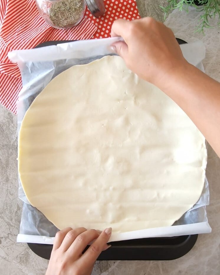 Unroll the puff pastry on a baking tray, leaving it on the parchment paper it comes with.