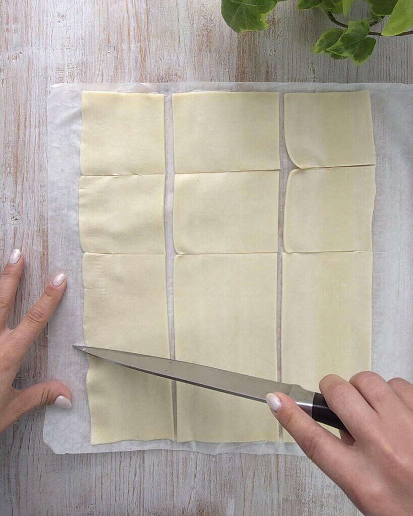 Unroll the ready-made puff pastry and then divide it into 12 pieces.