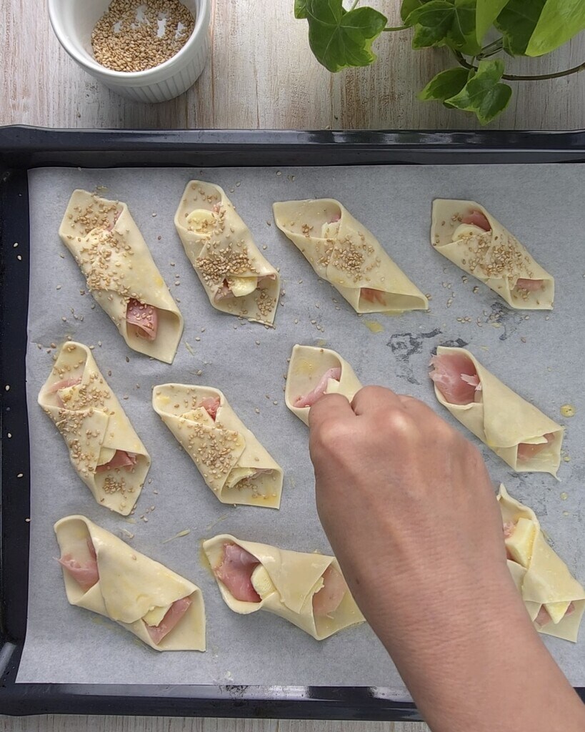 Close the edges forming cannoli and then place them on a baking tray lined with parchment paper, then brush the surface with beaten egg and garnish with sesame seeds.