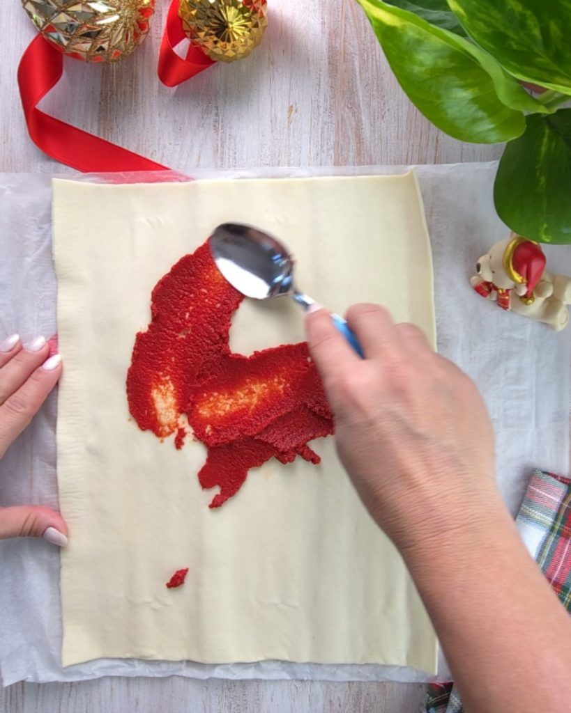 • First, unroll the first puff pastry roll, then spread the tomato paste over it.