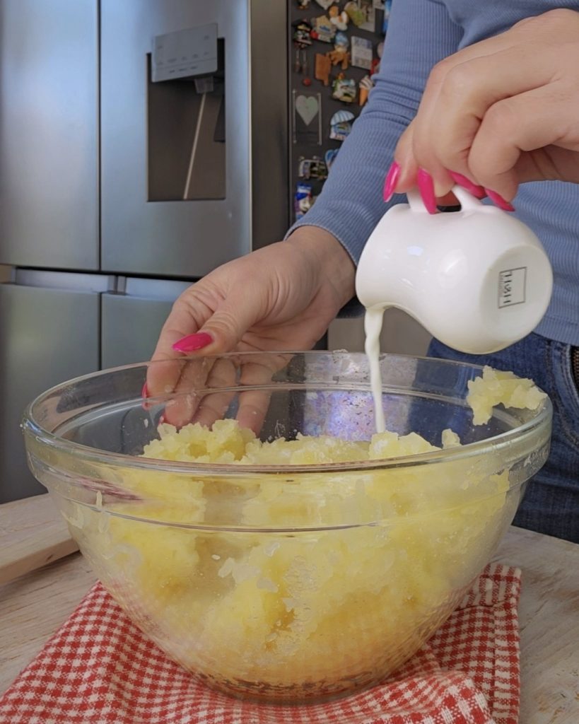 • Once cooked, drain and mash them in a bowl. Add a pinch of salt, the Parmesan, and pour in a little milk; mix well.
