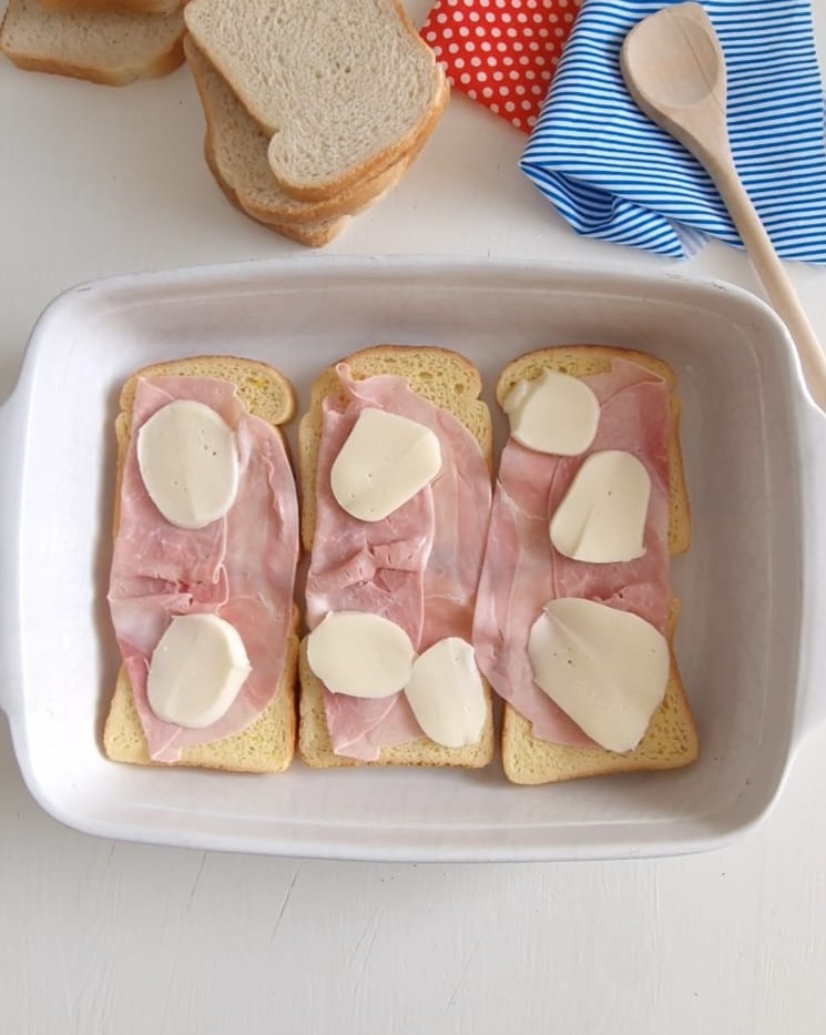 Fill each layer with cooked ham and cheese, then repeat for 3 layers.