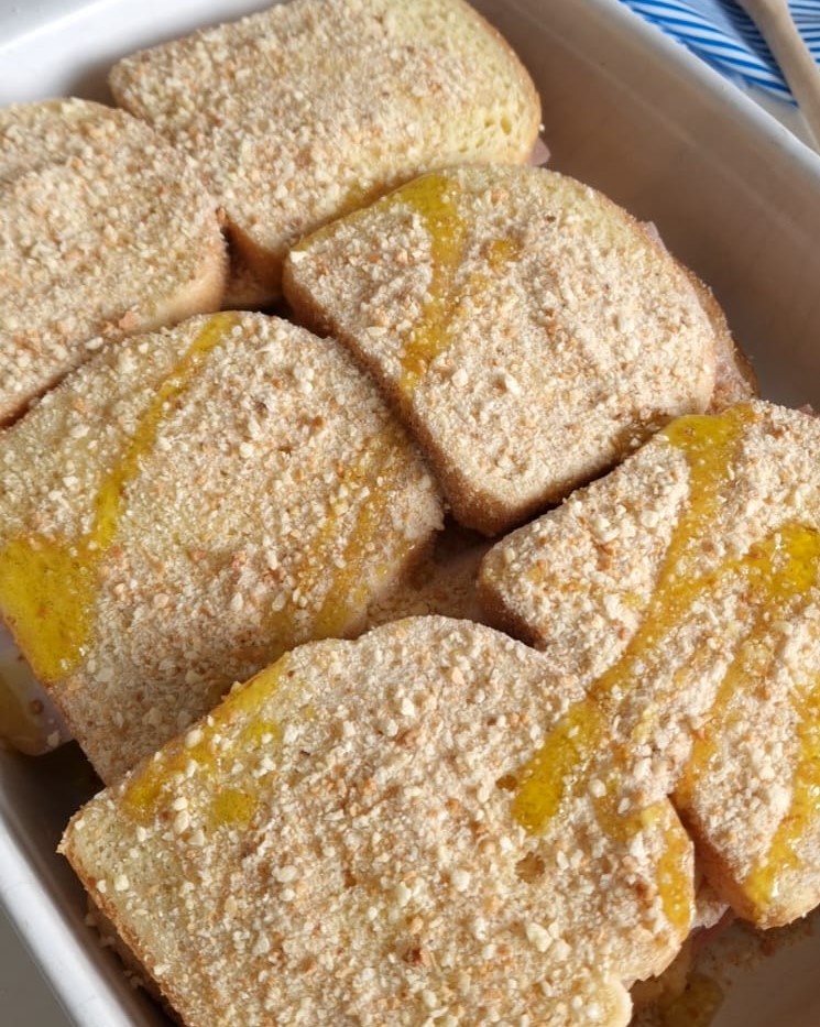 Sprinkle the top layer with breadcrumbs and drizzle with a bit of olive oil.