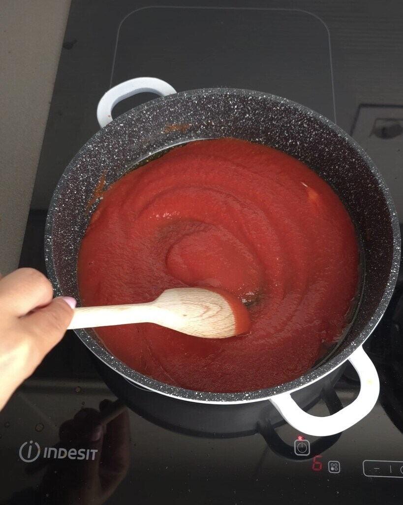 Meanwhile, in a pot, sauté a clove of garlic and a drizzle of extra virgin olive oil, then add the tomato sauce and season with salt and basil. Cook for about 10 minutes.