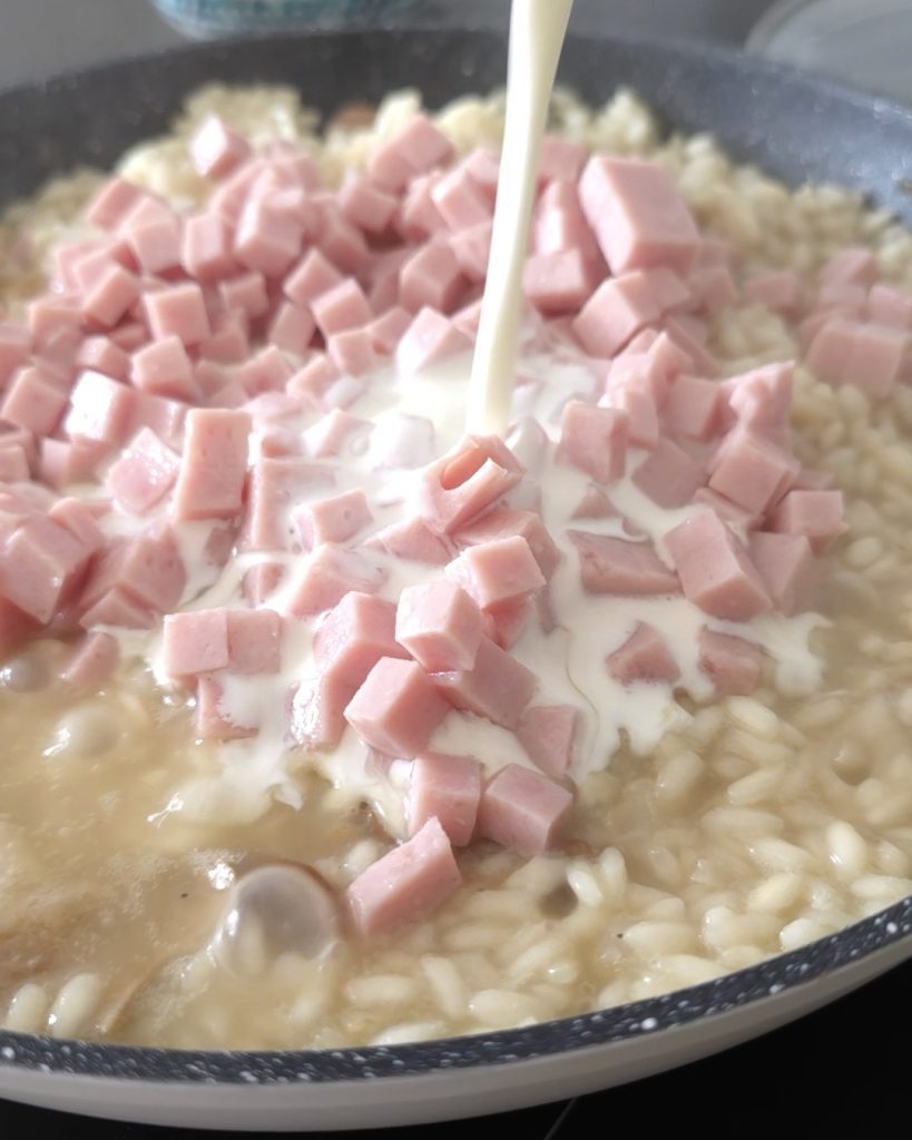 At the end of cooking, add the diced ham and the cream. Turn off the heat.