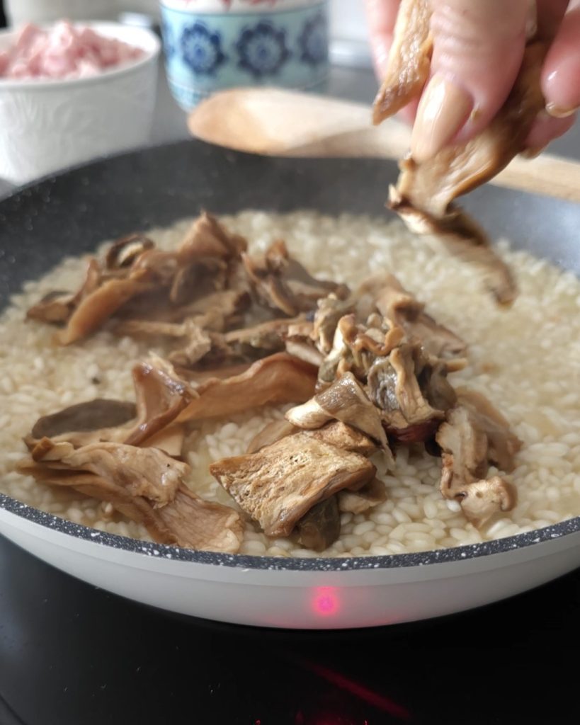 Add the squeezed mushrooms and a few ladles of hot broth to start the cooking process. Stir with a wooden spoon and, at the same time, move the pan back and forth with a firm motion (basically, make the rice jump).