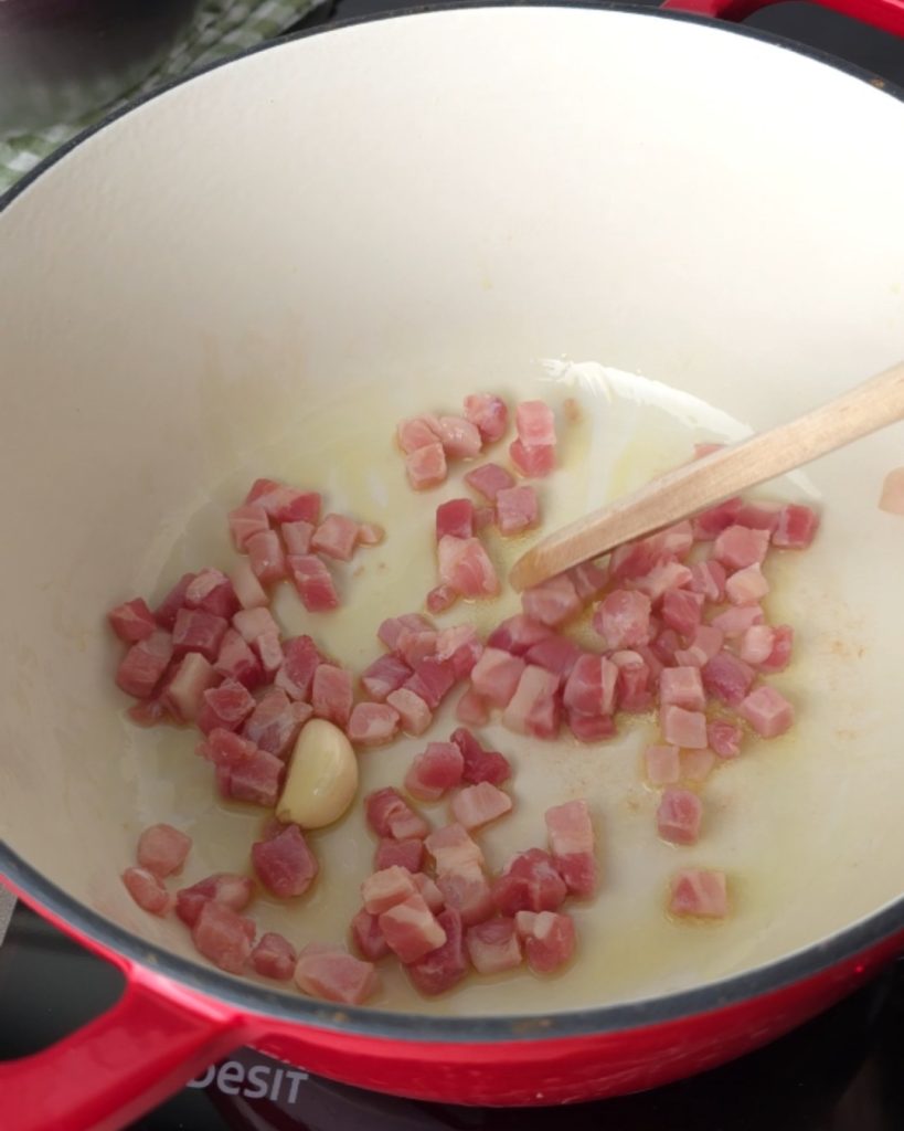 Sauté the garlic with a drizzle of oil, bacon, and chili pepper; the latter is optional.