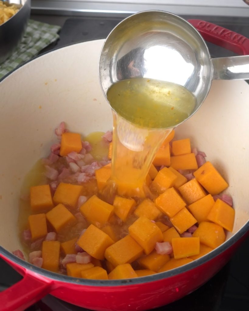 Add the pumpkin, cut into cubes, and cook for a couple of minutes, then pour in the hot broth.