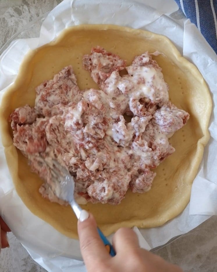 At this point, prepare the filling: in a bowl, put the sausage and stracchino, mix well, and spread the mixture over the dough.