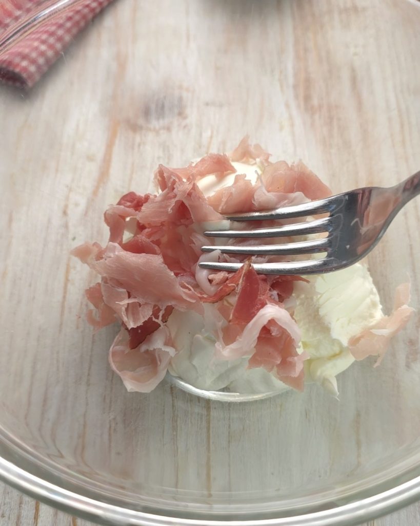 • In a bowl, mix the spreadable cheese, 3 slices of speck cut into small pieces, and the grated cheese.