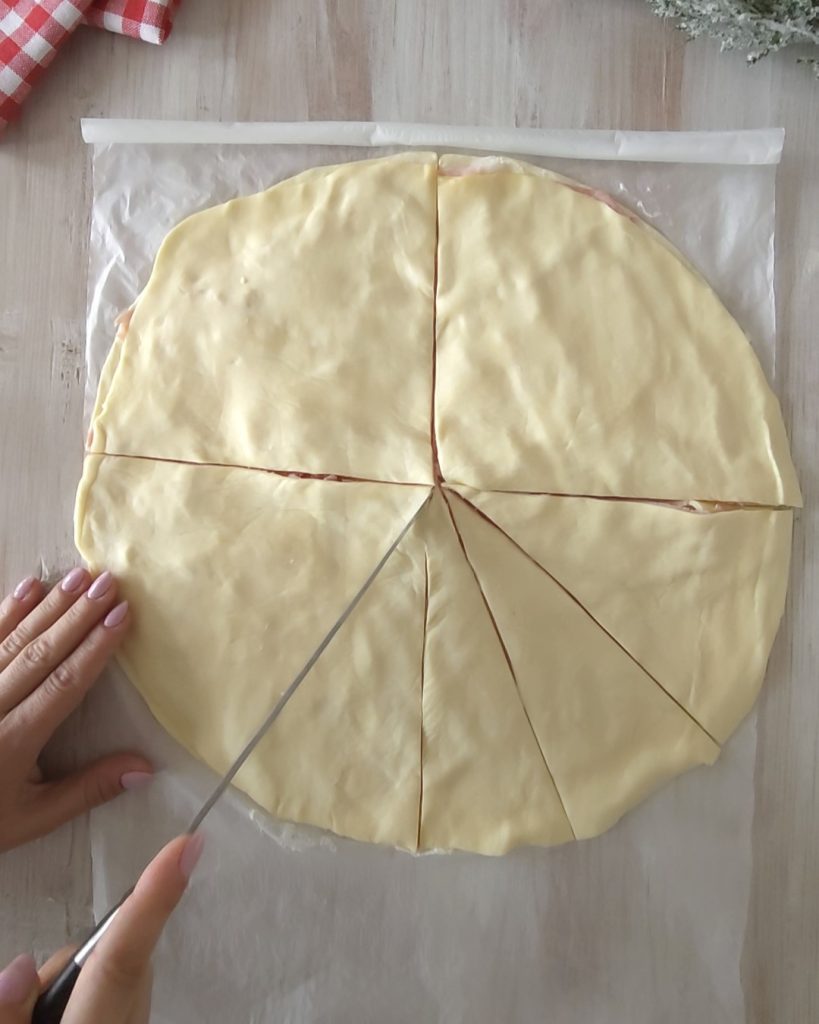 As the first step, unroll the round puff pastry on a surface and spread the Philadelphia, then add the cooked ham and cheese.