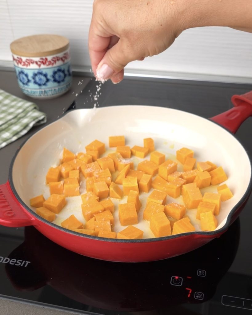 First, clean the pumpkin and then cut it into small cubes. Sauté a garlic clove with a drizzle of oil, add the pumpkin, and salt.
