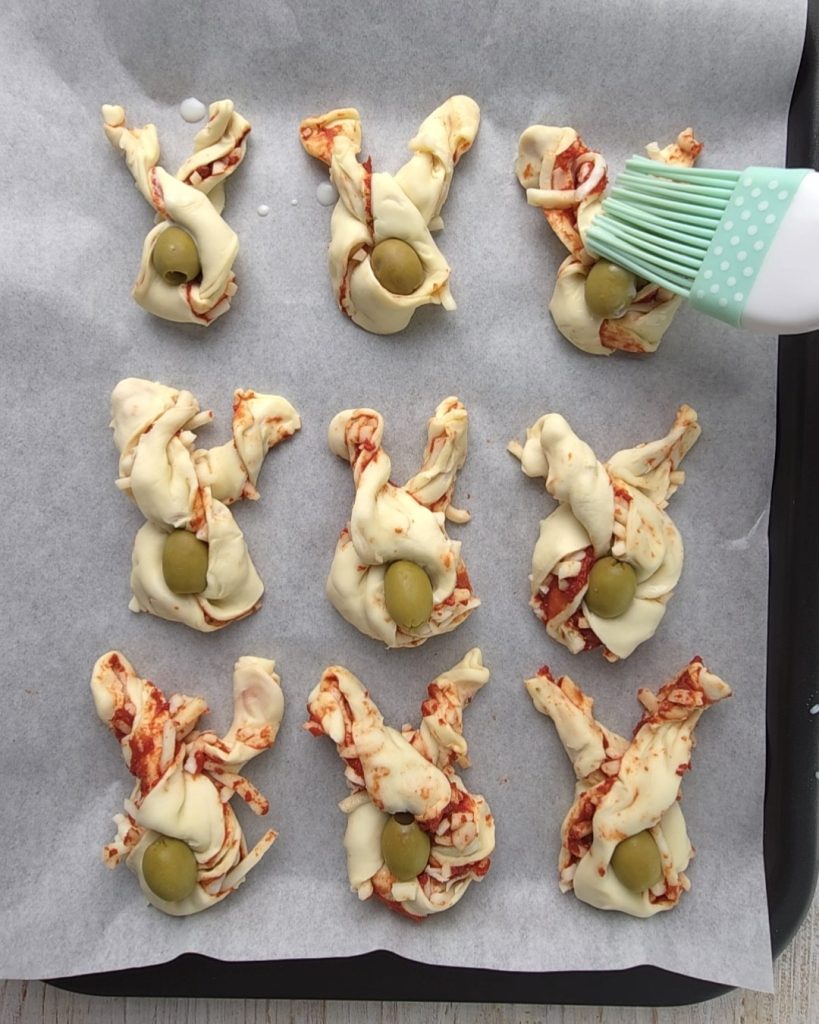 Arrange all the bunnies on a baking tray lined with parchment paper and brush with milk. Bake in a preheated oven at 374°F for about 12 minutes or until golden.