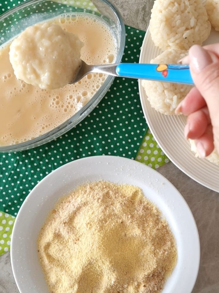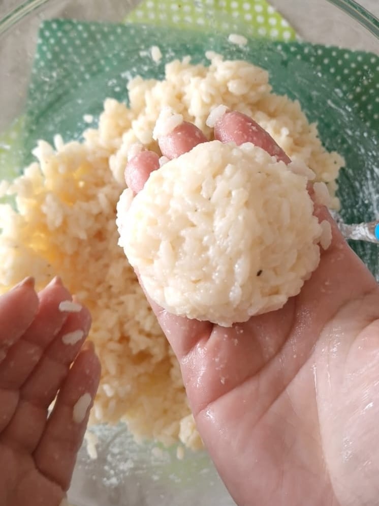 • Start by boiling the rice in salted boiling water, then drain it and let it cool slightly. Next, season it with the grated Parmesan, egg, salt, and pepper.