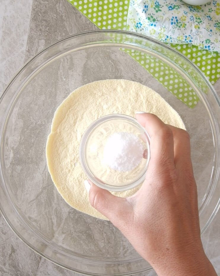 As the first step, take a large bowl, pour in the flour, 1 pinch of baking soda, and the salt, then mix and make a well in the center.