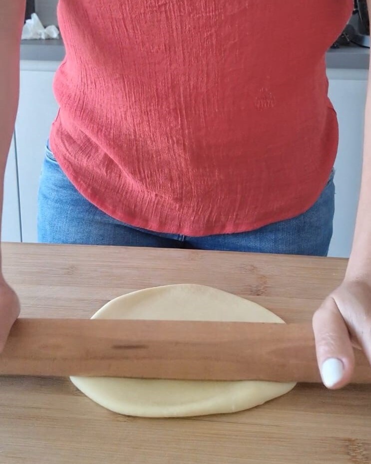 Divide the dough into 5 parts and use a rolling pin to form the flatbreads.