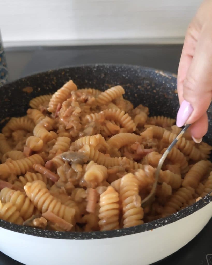 Combine the mushrooms and speck with the meat and tomato sauce and stir. Add the fresh cream and finish cooking for another 2-3 minutes.