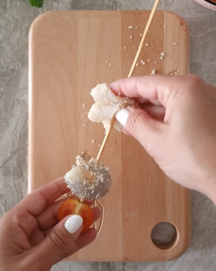 • For assembly, take a skewer and alternately insert the fish with cherry tomatoes until the ingredients are used up.