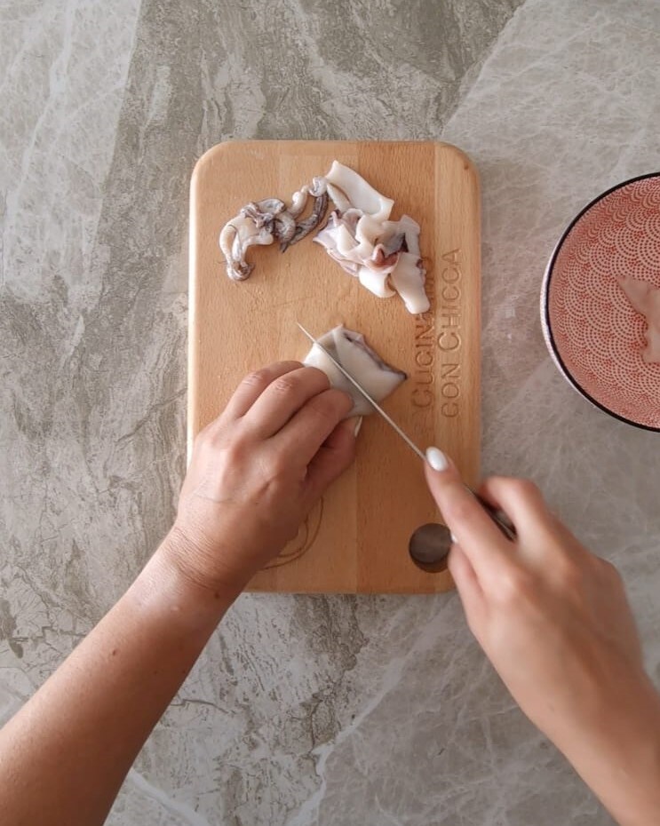 • Start with the shrimp: wash them, remove the head and legs, then peel off the shell. At this point, use a toothpick to remove the black line that runs through the body, (the intestine), being careful not to break it.